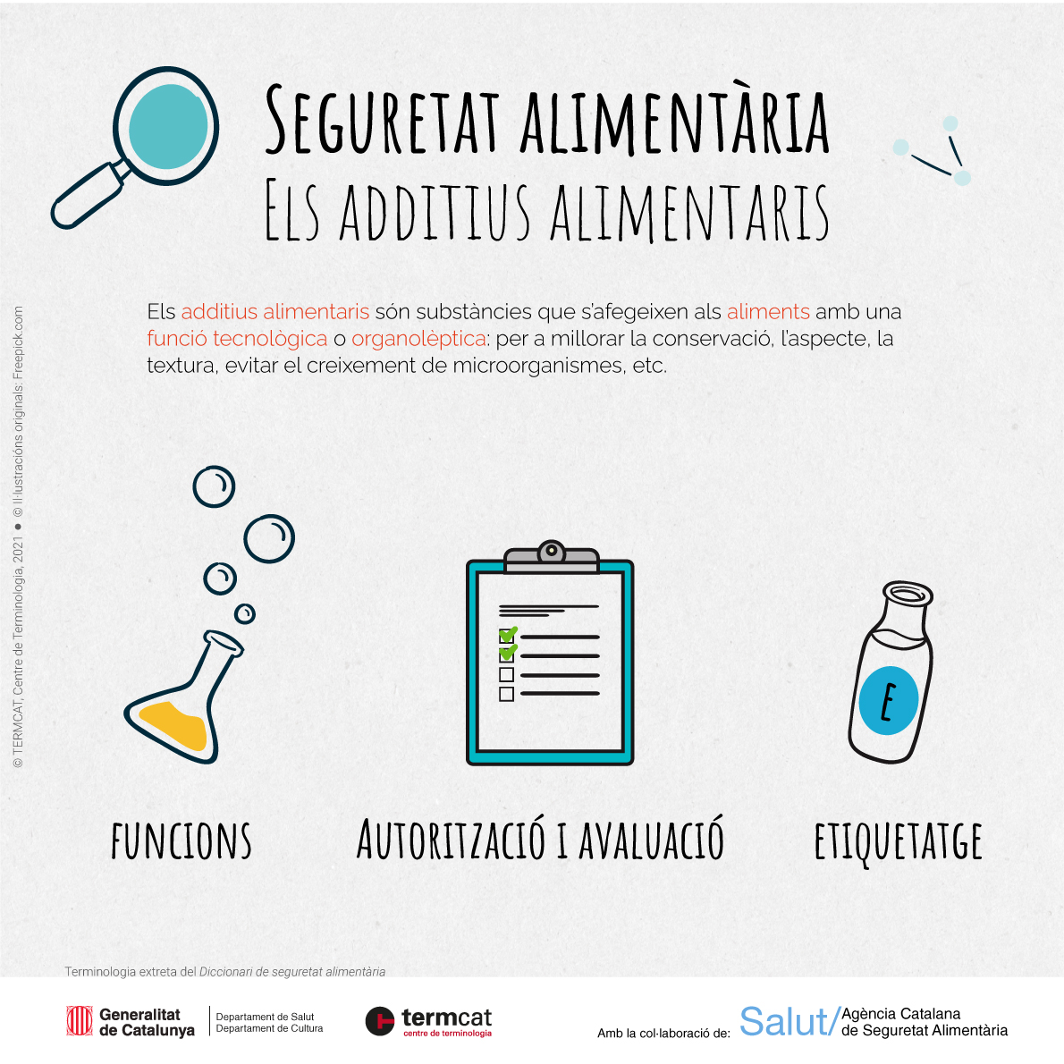 TERMCAT, CENTRE DE TERMINOLOGIA. Seguretat alimentària: els additius alimentaris [en línia]. Barcelona: TERMCAT, Centre de Terminologia, 2021. 1 infografia.