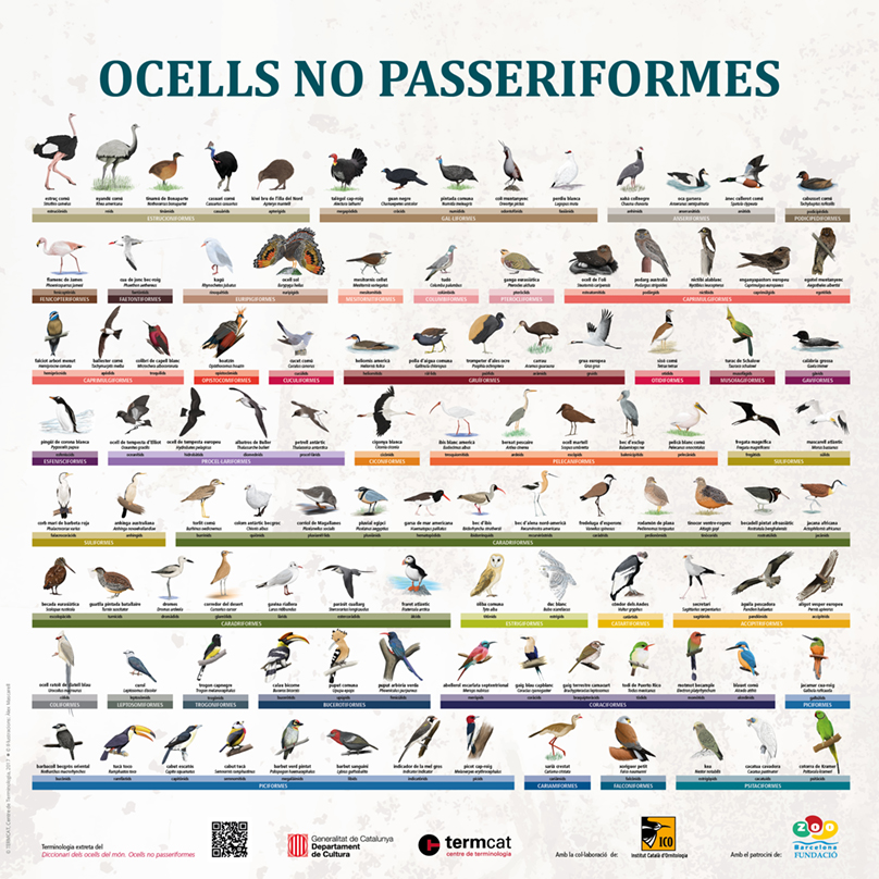 TERMCAT, Centre de Terminologia. Ocells no passeriformes [material gràfic]. Barcelona: TERMCAT, Centre de Terminologia, 2017. 1 infografia interactiva.